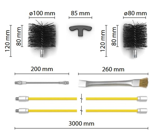 Комплектът включва жило с дължина 3 м, две четки ф80 мм и ф100 мм и универсална четка за печка за максимално почистване. Има и гъвкава връзка за по-лесно достигане до трудно достъпни места.